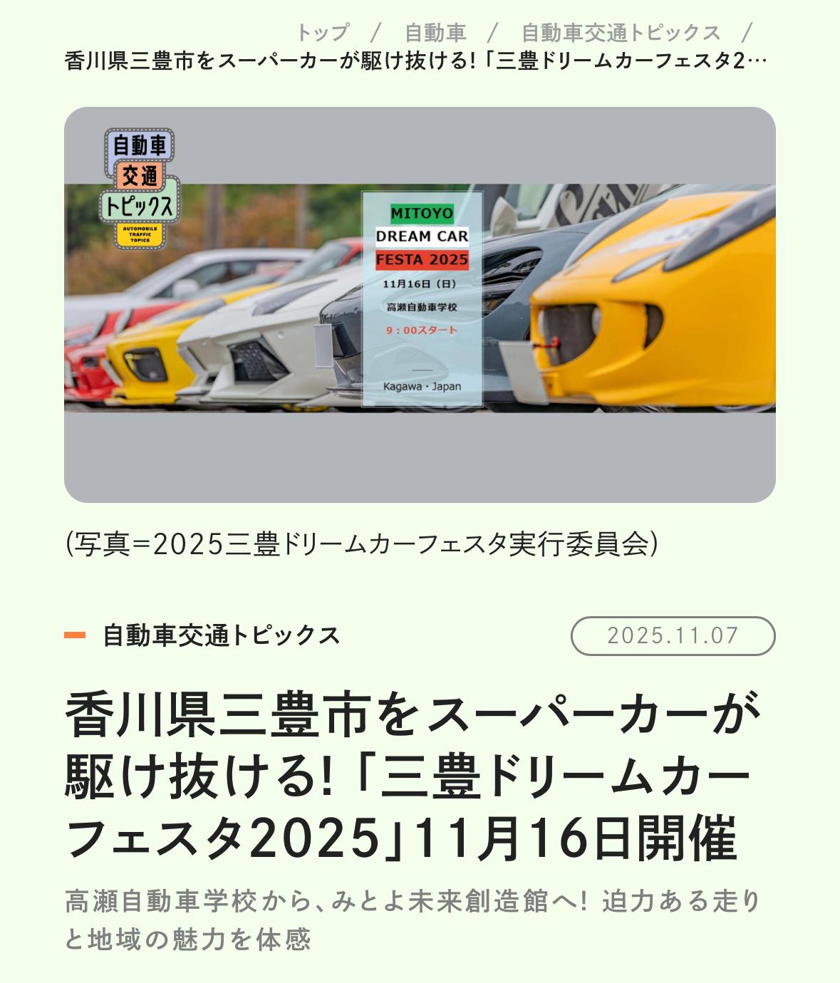 この度は「三豊ドリームカーフェスタ」にご参加いただき、誠にありがとうございました。 スーパーカーオーナーの皆様には、スマートで安全な走りと洗練されたふるまいで会場を彩っていただき、地域のファンに大きな感動を届けてくださいました。